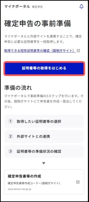 「ホーム」より「確定申告」をタップすると、「確定申告の事前準備」ベージが表示されるため、「証明書等の取得をはじめる」を選択してください。