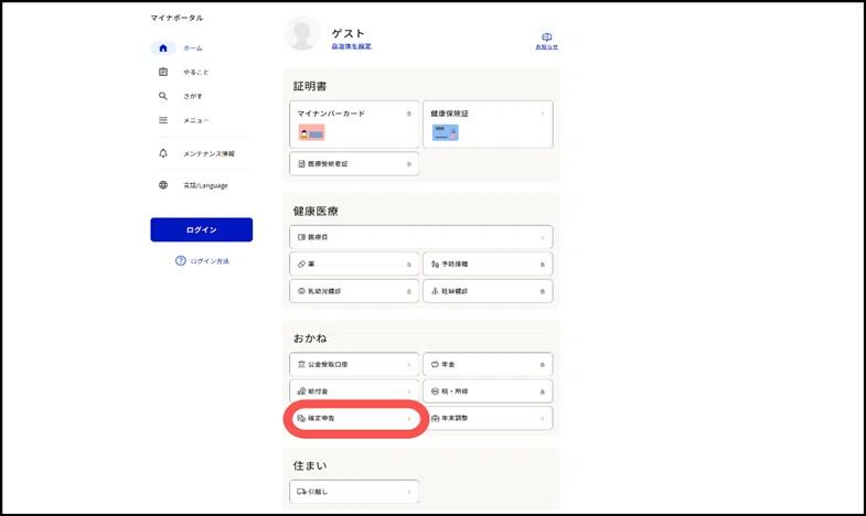 以下のリンクより、マイナポータルのトップページの左下にある「ログイン」を押して、ログインしてください。